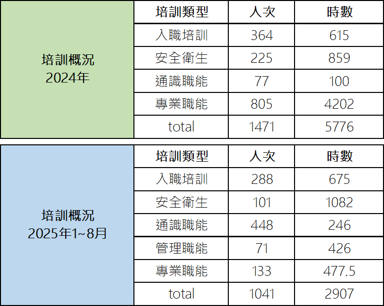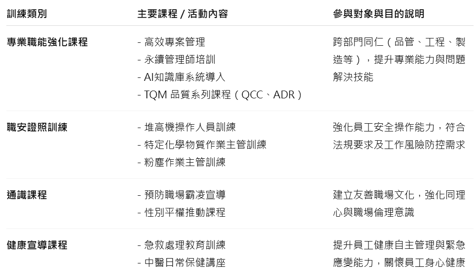 溢泰依據組織需求與員工發展階段,規劃短、中、長期培訓目標。短期強調新進人員快速上手;中期著重溝通能力與領導力培養;長期建立完整職能架構,提升整體競爭力。另同步推動接班人計畫,從人才識別到實務歷練,逐步培養關鍵職位接班力,確保組織穩定發展。